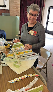 Roberta has out done us all with the embroidery on the piece above. She really pushed the envelope with all the innovative embroidery she used. I see a program in her future. Her quilt below used a forest jewels jelly roll and added the always attractive prairie points.
